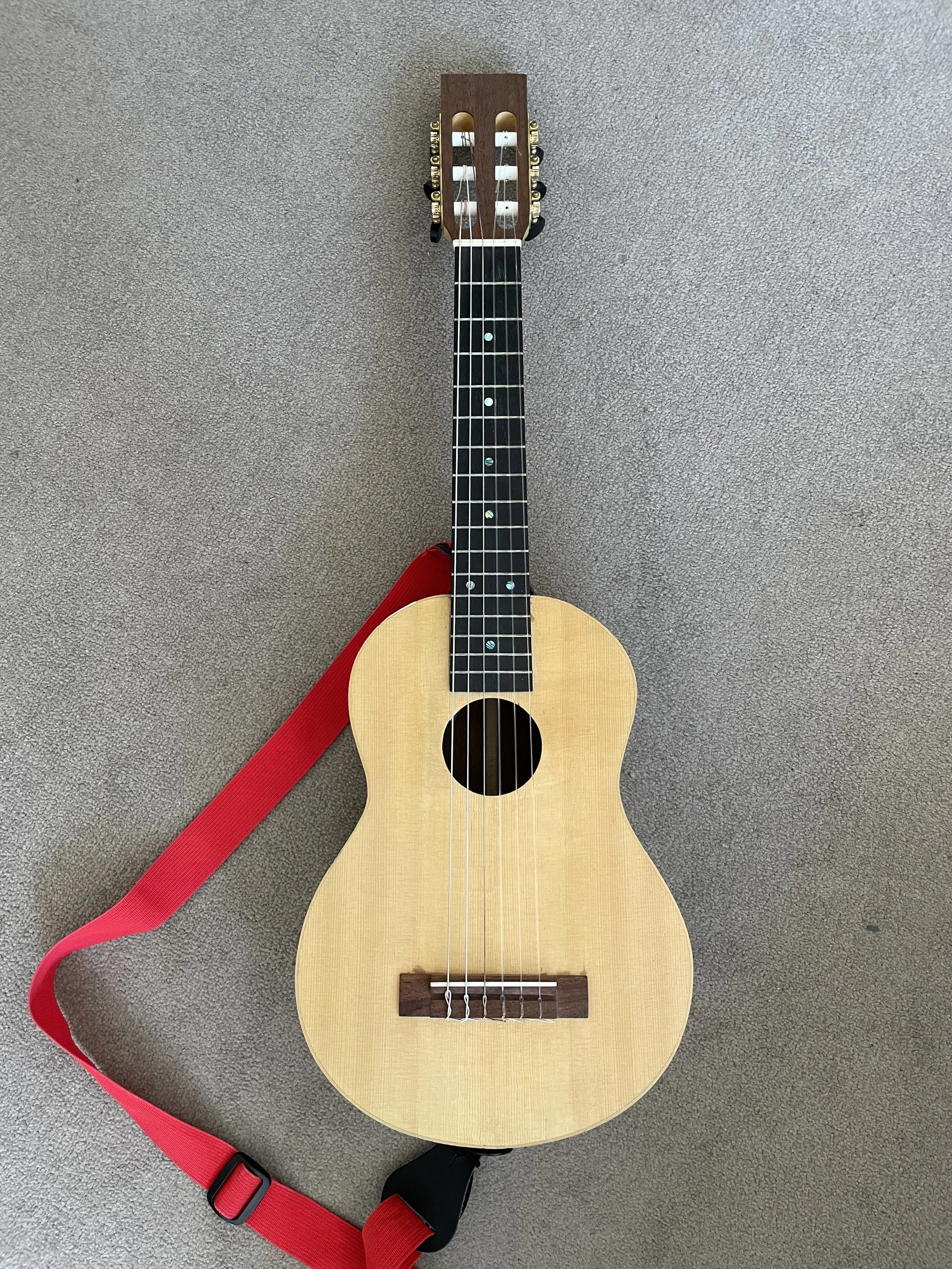 Materials: Engelmann spruce top, walnut back and sides, mahogany neck, ebony fingerboard, nickel tuners, Tru-oil finish.